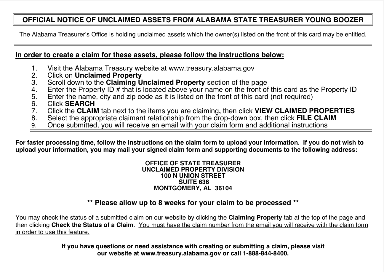 The “Quick Claim” card would have been mailed to you from the Alabama Unclaimed Property division of the Office of State Treasurer because they have received lost funds that may be owed to you. They are required by law to notify possible claimants of funds being held that have been turned over to this office.
