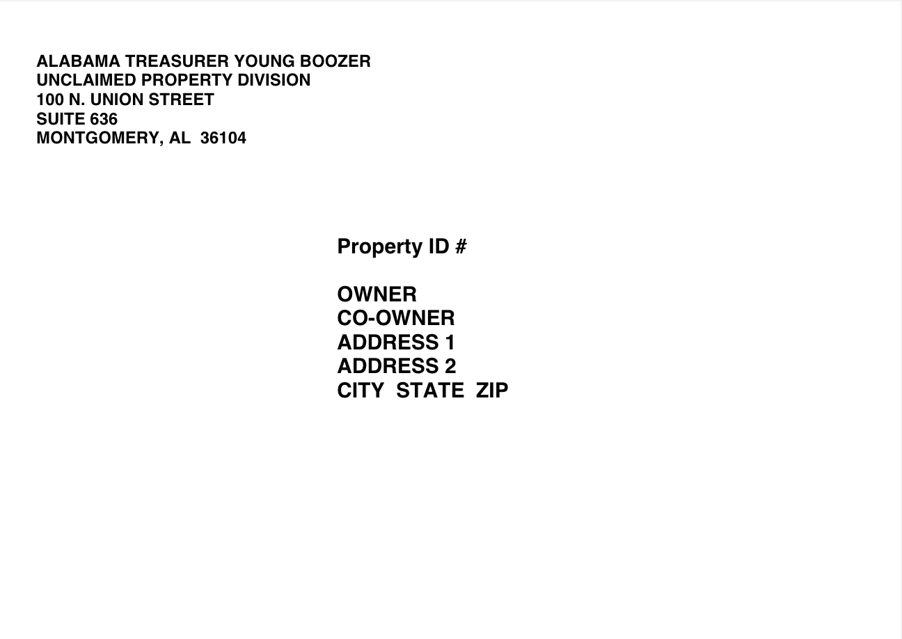Office of State Treasurer, Unclaimed Property Division, P.O. Box 302520, Montgomery, AL 36130-2520